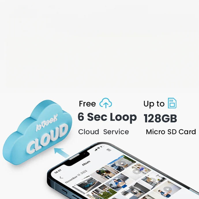 ieGeek cameras support 32~128GB Micro SD card(not include) and provide 7-days free cloud storage.