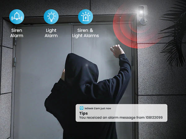 - PIR Motion Detection & Siren Spotlight Alarm: ieGeek magnetic battery camera is equipped with PIR motion sensor and advanced AI algorithm, which significantly enhance humanoid identification and reduce false alarms. The siren and spotlight will turn on to warn potential intruder as soon as movement is detected at night. When camera detect movement, it start to record and send real-time notifications to your phone, reminding you to check suspicious activity in time.