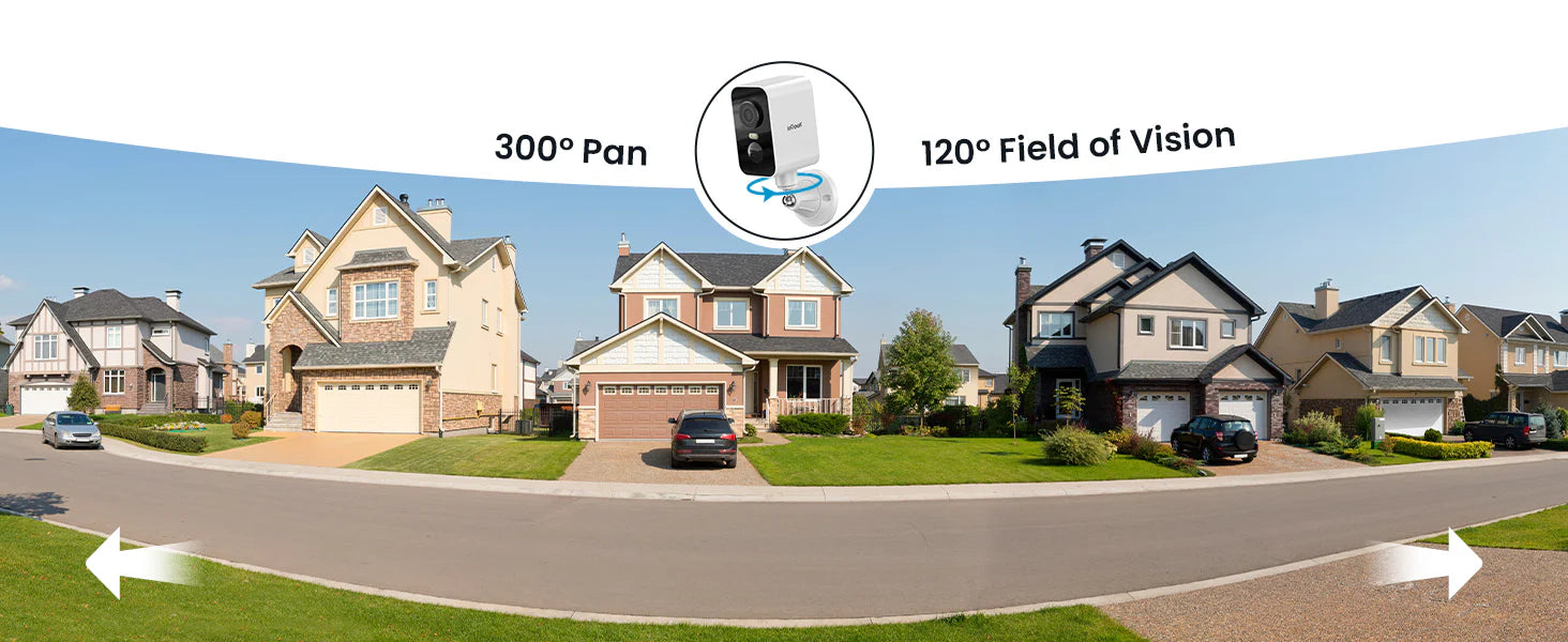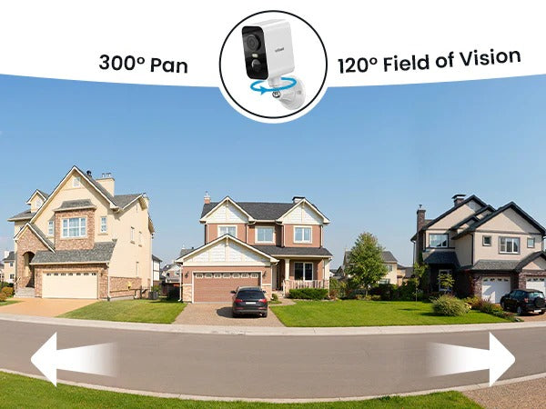 Security camera panning scans car parks/backyards wider than human eyes. 120° vertical tilt monitors from gutters to ground level, eliminating blind spots.