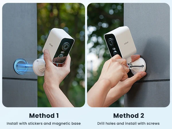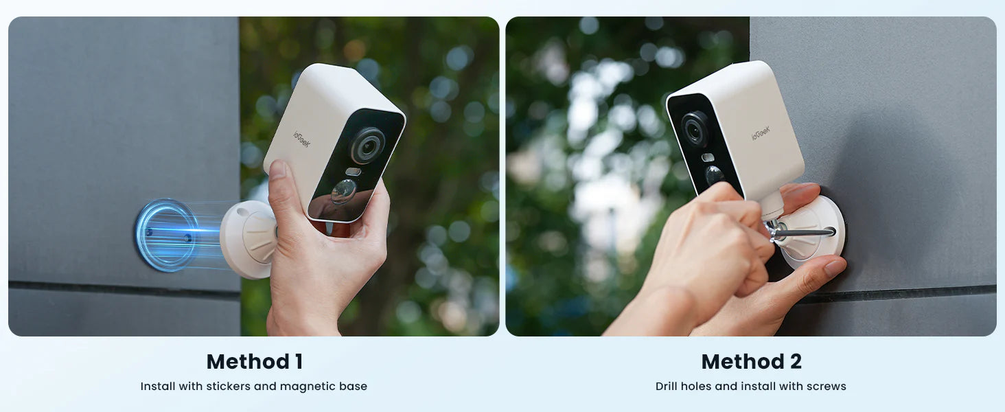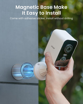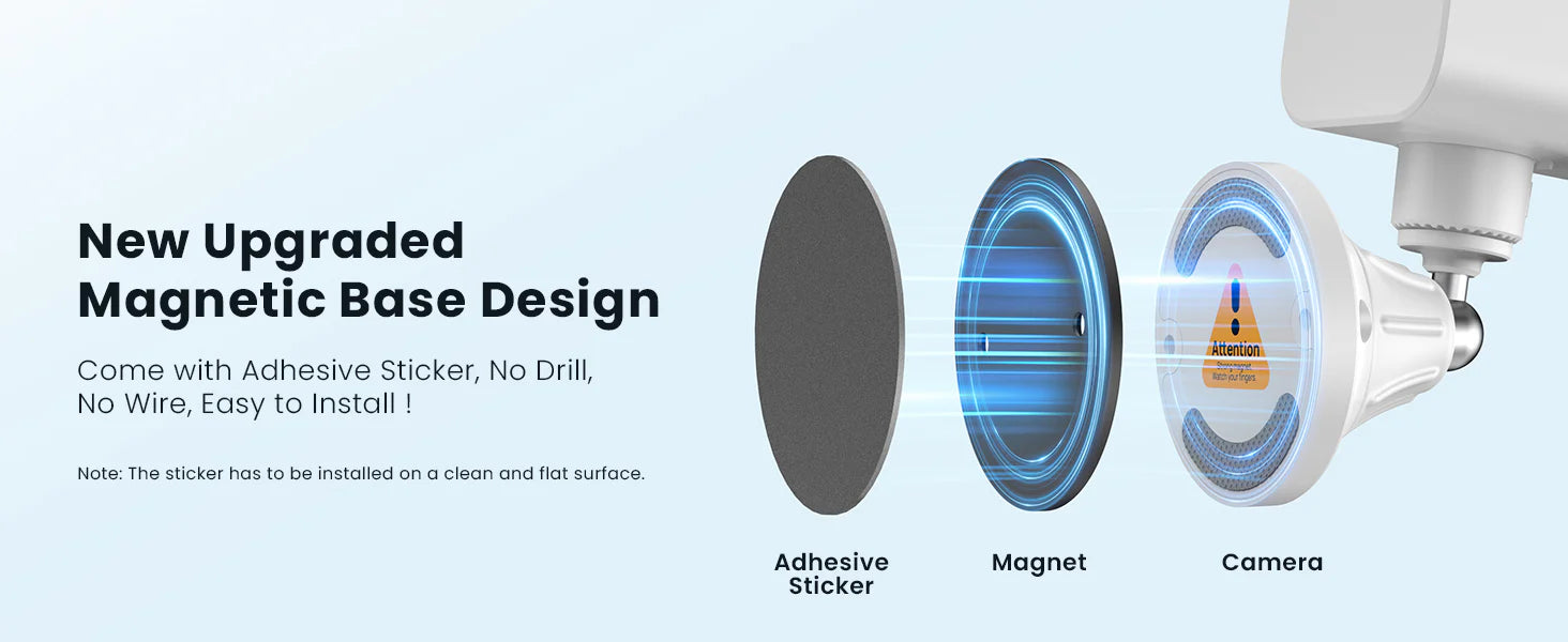 - New Upgraded Magnetic Bracket & No Drilling No Holes: ieGeek security camera come with magnetic bracket and adhesive stickers, you don't need to drill holes to install it anymore. Adhere the sticker to the wall, and adhere the magnetic base to the sticker, and attach the camera to the magnetic base, then done! You can easily install it within 3 minutes and leave no holes in the wall.